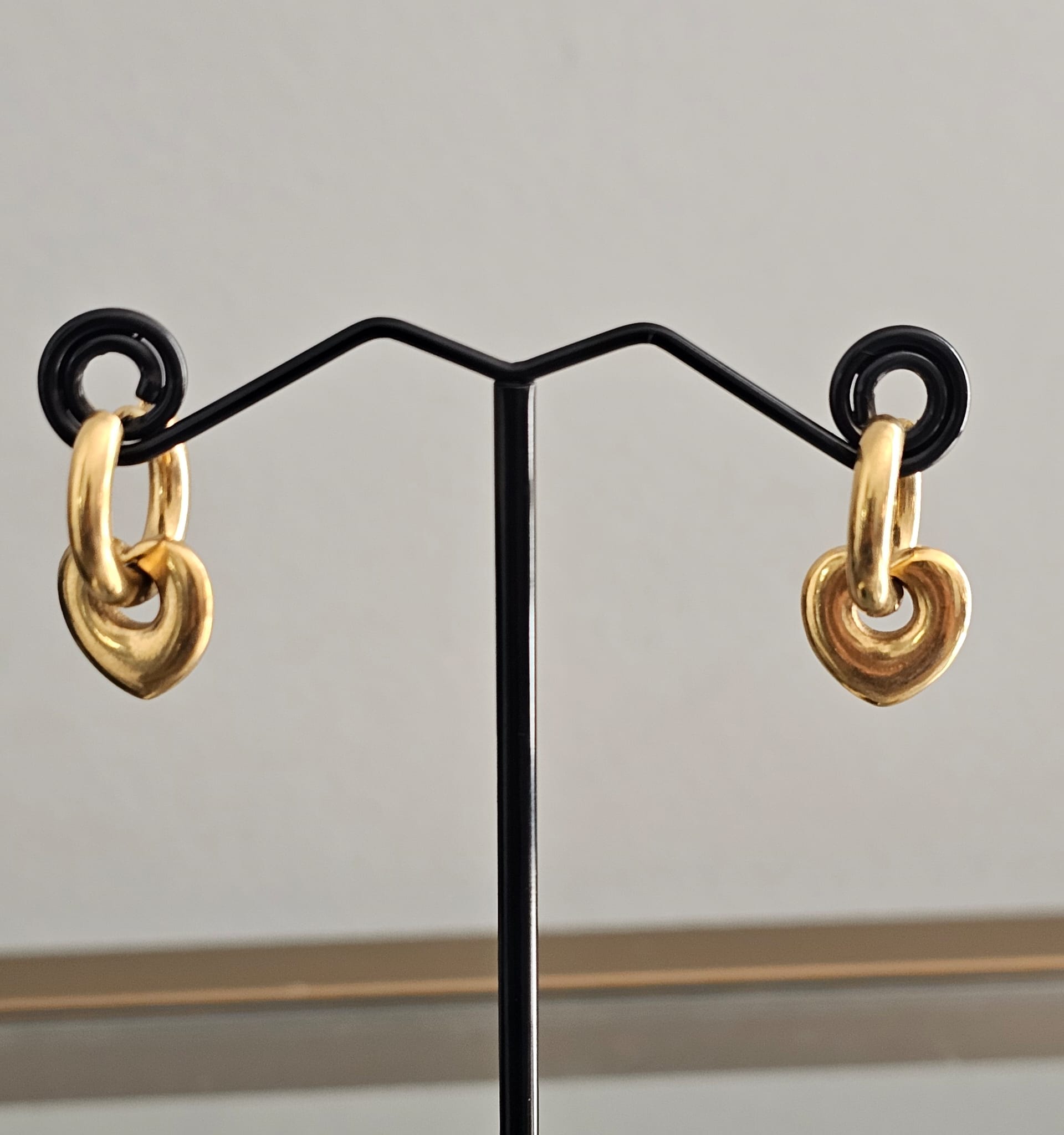 Dangling from the bottom of each hoop is a delicate heart charm, adding a romantic and whimsical element to the design. The heart is also gold-plated, matching the hoops and creating a cohesive look. The combination of the chunky hoops and the dainty hearts strikes a perfect balance between boldness and subtlety, making these earrings versatile enough to complement both casual and formal outfits.