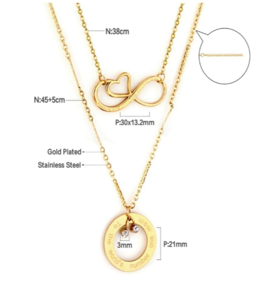 The “To the World’s Number One Mom” Necklace is a heartfelt piece that beautifully combines elegance with sentimental value. This gold-plated, non-tarnish necklace features two distinct pendants layered in a fashionable manner. The upper pendant is an infinity symbol, representing eternity and everlasting love. Below it hangs a circular pendant with an engraved message that reads “to the world’s number one mom,” expressing deep appreciation and love for a mother.