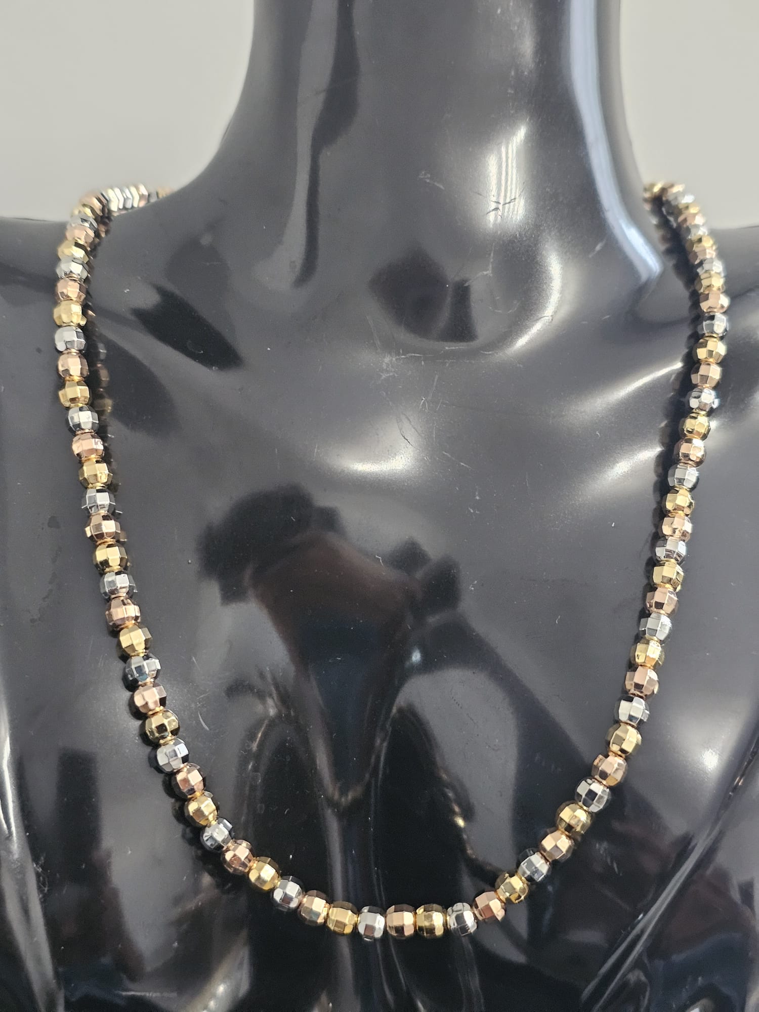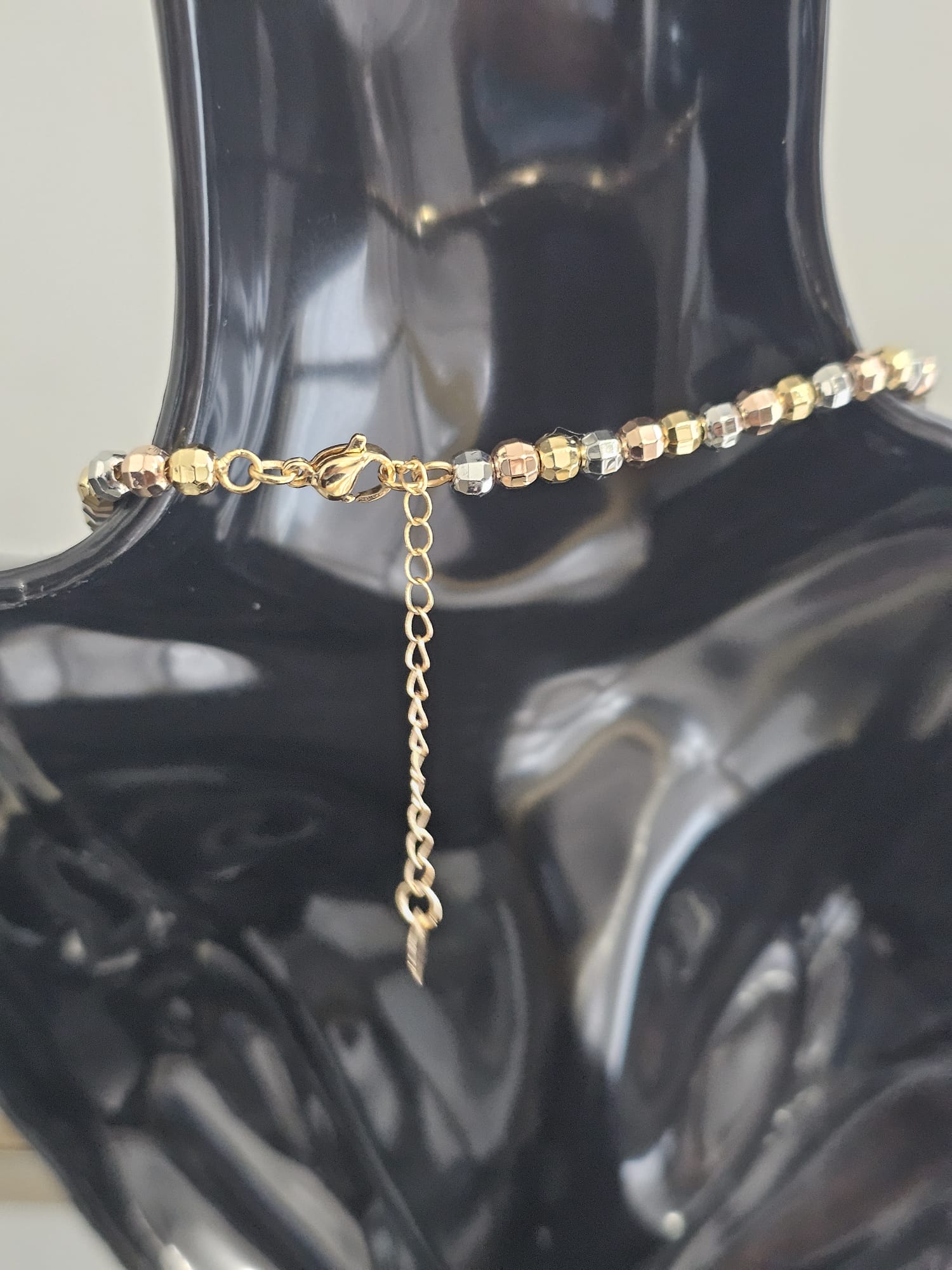 The gold-plated finish ensures that the “Tri-Color Harmony Necklace” maintains its shine and brilliance over time, making it a durable and long-lasting accessory. The alternating beads create a harmonious blend of colors, making this necklace versatile enough to complement a variety of outfits. Whether worn casually or for a special occasion, this necklace adds a touch of elegance and sophistication.