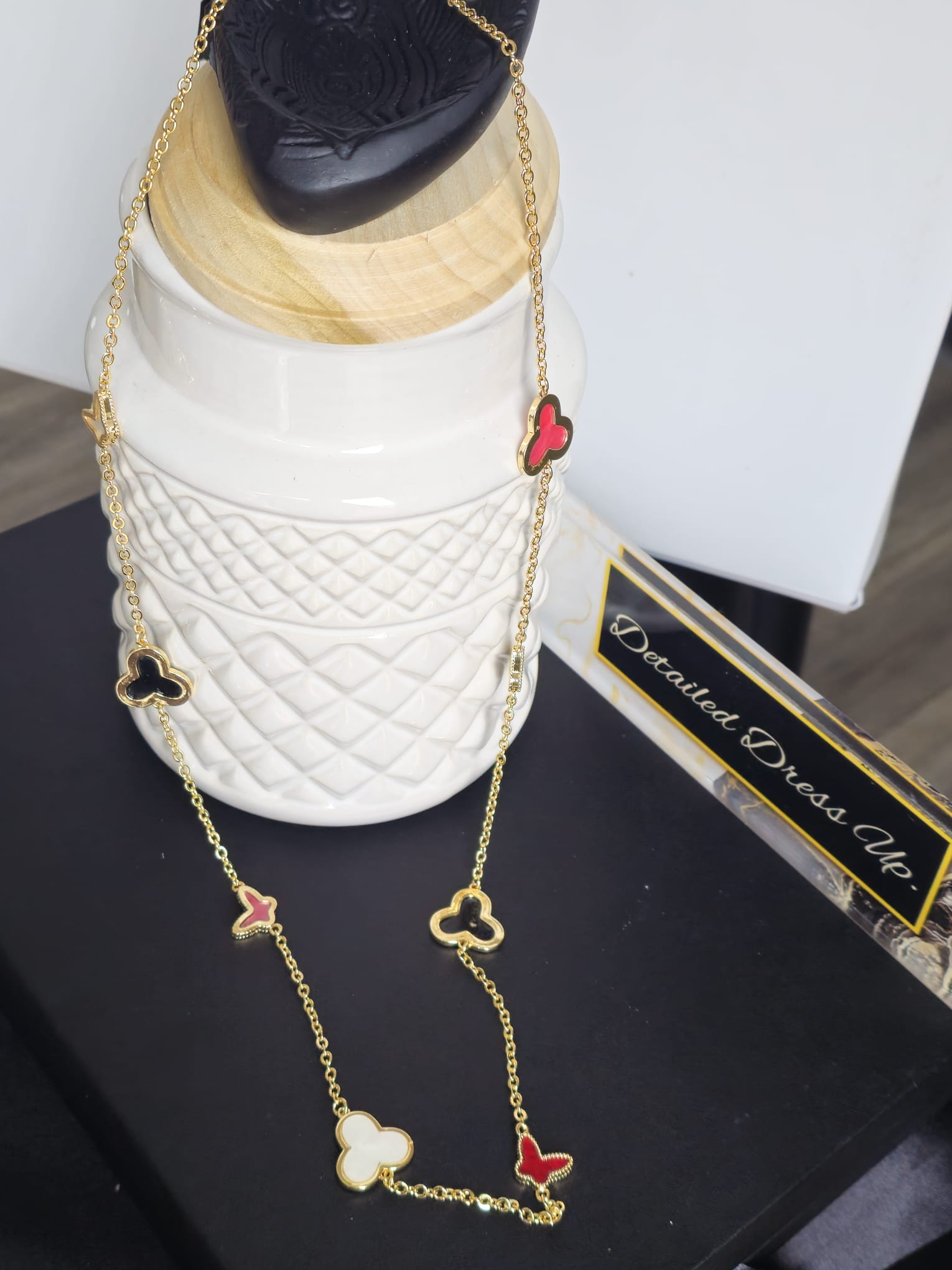 The gold plating is non-tarnish, ensuring that the necklace maintains its radiant shine and beauty over time. The combination of the red, black, and white clovers and butterflies with the gold chain creates a striking contrast, making this necklace a standout accessory. The length of the necklace allows it to be worn in various styles, whether draped elegantly over a dress or layered with other pieces for a more contemporary look.