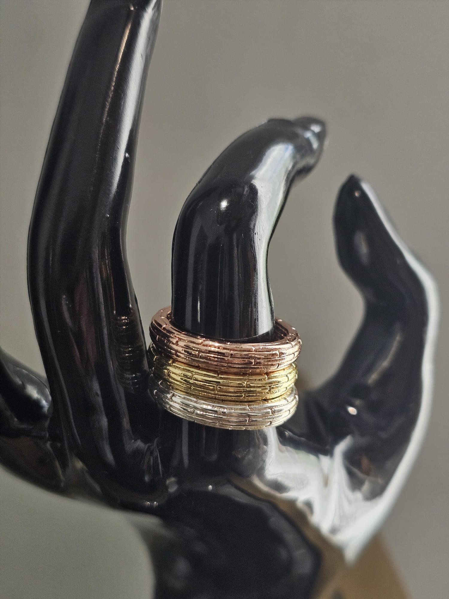 The “Tricolor Harmony Ring Set”, is a beautifully crafted collection that combines elegance with versatility. The set features three distinct rings, each with a unique tone: gold, silver, and bronze. These rings are designed to be worn together, creating a harmonious and eye-catching look.