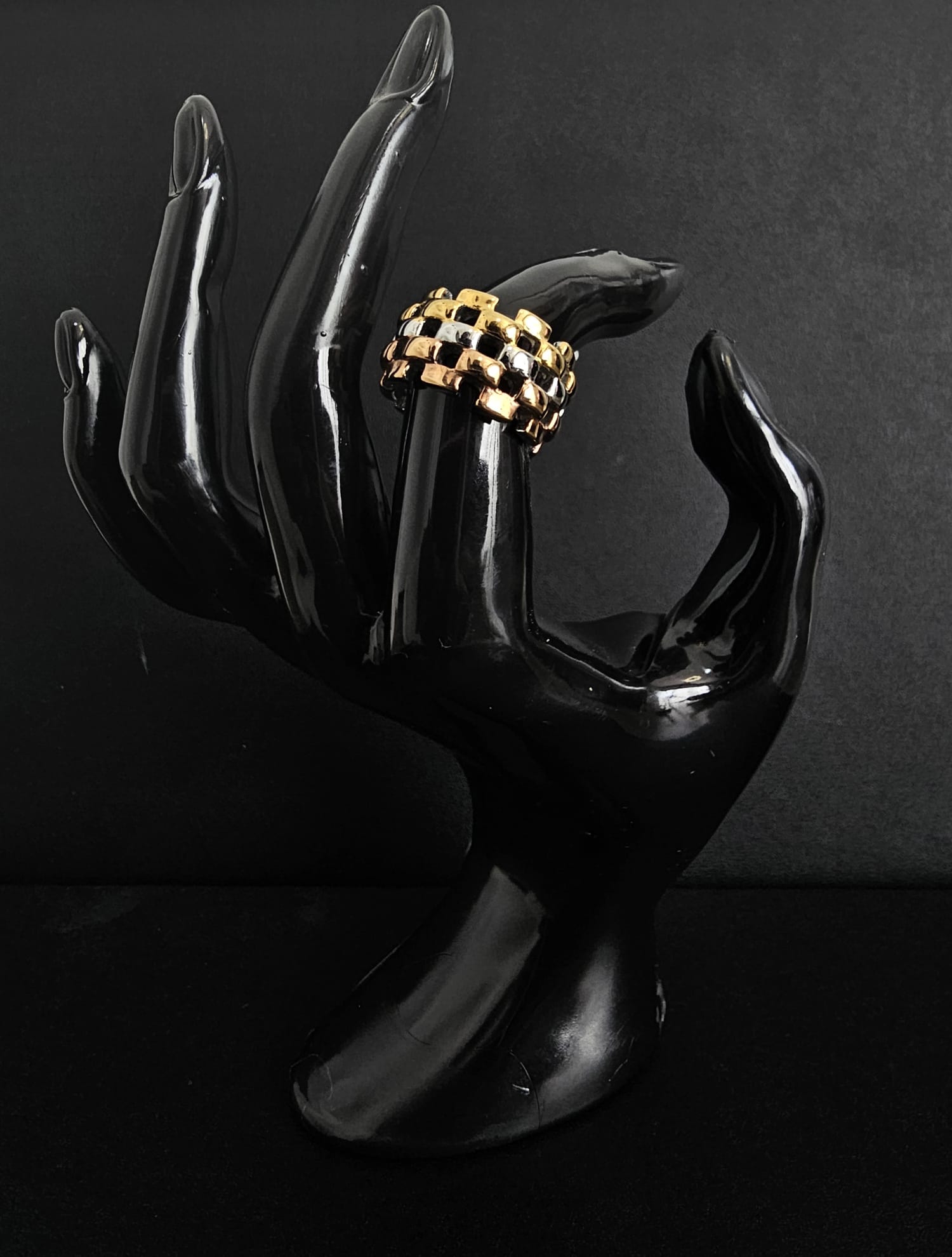 The “Golden Mosaic Ring” is a beautifully crafted piece that combines elegance with a unique design. The ring features multiple raised, rounded rectangular sections that encircle the band, creating a textured and dimensional appearance. The gold plating gives the ring a lustrous finish, ensuring it stands out as a statement piece.