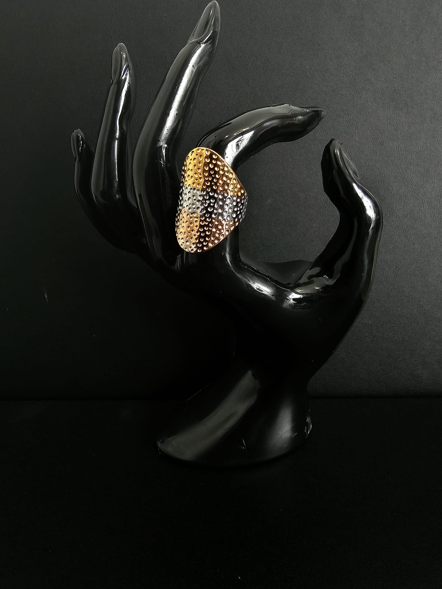 The “Dual Elegance Ring” is a beautifully crafted piece that combines intricate design with luxurious appeal. The ring features an ornate pattern with interlocking elements, giving it a textured and dimensional appearance. The gold plating provides a rich, lustrous finish, ensuring it stands out as a statement piece.