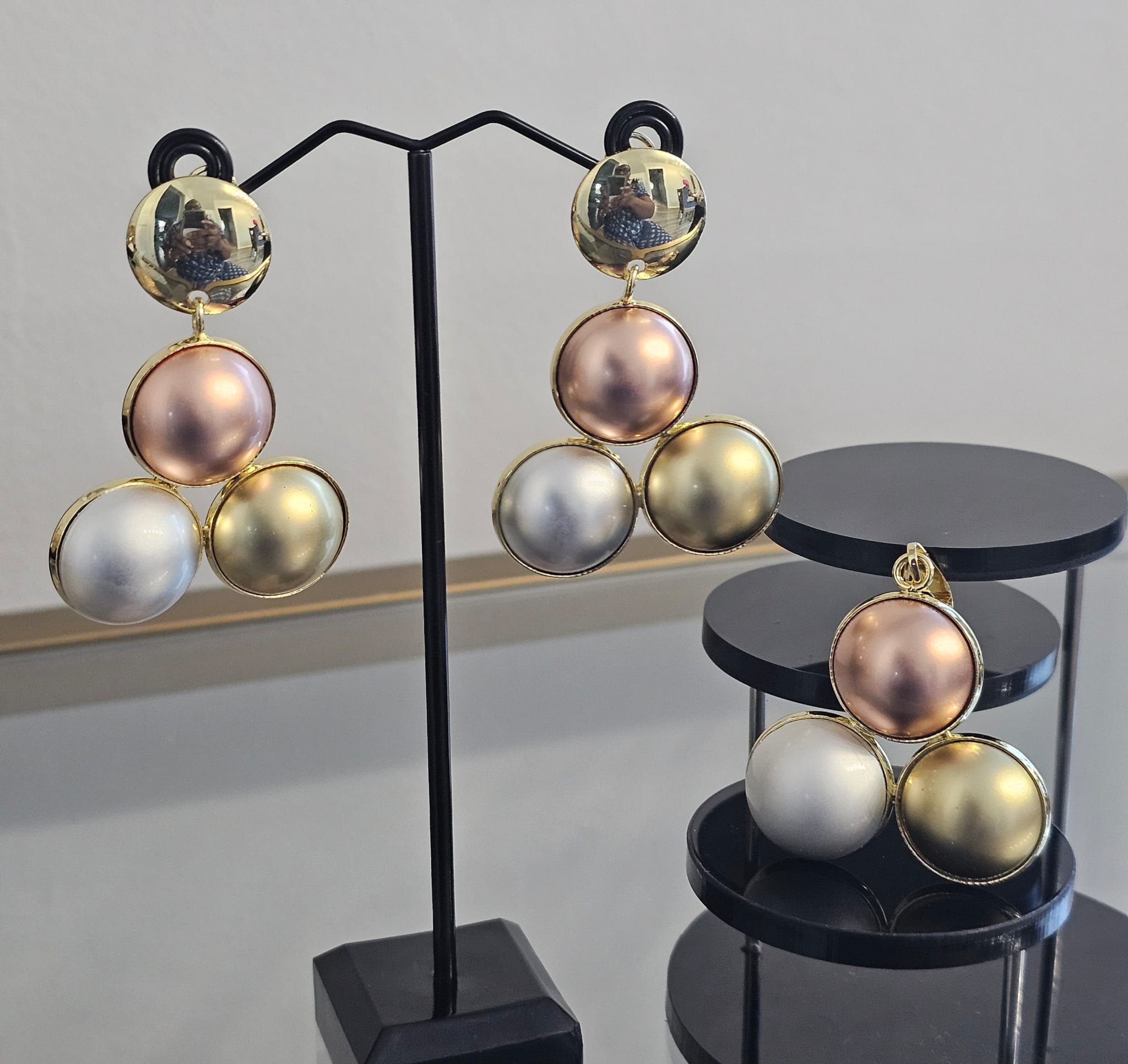 The earrings feature three interlopped hoops, each adorned with a small, polished sphere in a different tone: warm gold, rich bronze, and sleek silver. The interplay of these three tones creates a harmonious and eye-catching look. The spheres are meticulously crafted to highlight their unique colors, making these earrings a standout piece. They are lightweight and comfortable, with a secure latch-back closure that ensures they stay in place throughout the day.