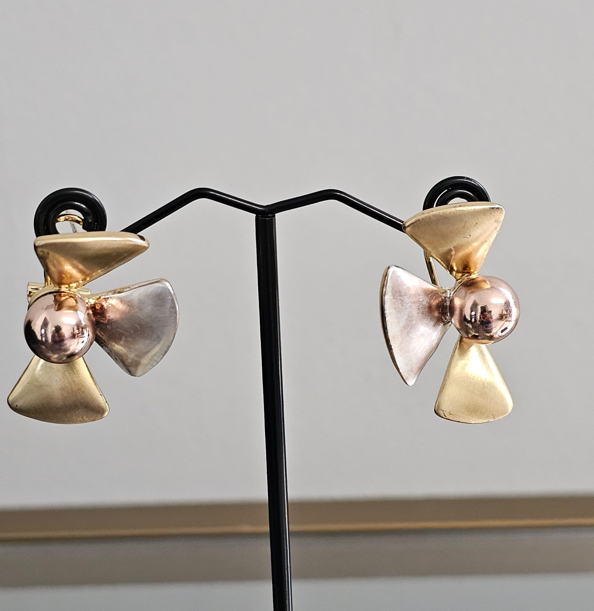 The Trinity Radiance earrings are a stunning example of modern elegance and intricate design. Each earring features a three-arm fan-like structure, creating a dynamic and eye-catching silhouette. The arms are three-toned, blending shades of gold, silver, and rose gold to create a harmonious and versatile color palette.