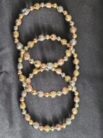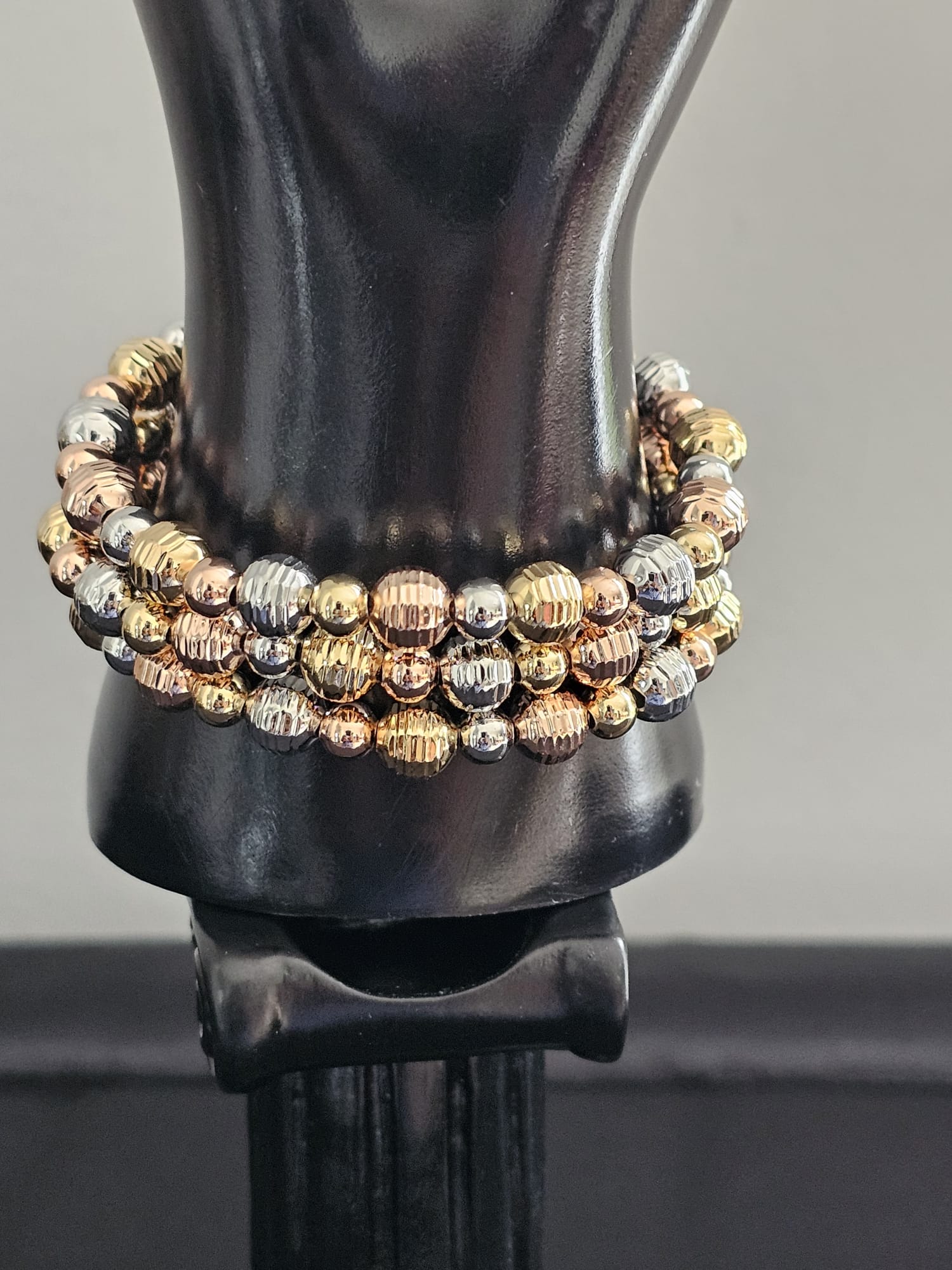 The Trio Elegance Stack combines the elegance of gold, silver, and bronze with a contemporary design featuring alternating large and small balls. The textured large balls add a touch of sophistication, while the elastic bands provide practicality and comfort. This set is perfect for those looking to enhance their jewelry collection with a versatile and stylish trio that can be worn together or separately to complement a range of outfits.