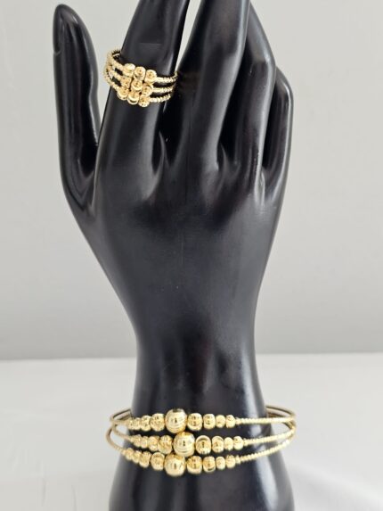 The Golden Tiered Elegance Duo is a sophisticated two-piece set crafted from gold-plated stainless steel, featuring a bracelet and a ring that embody luxury and refined style. The Ring is One Size fits all.