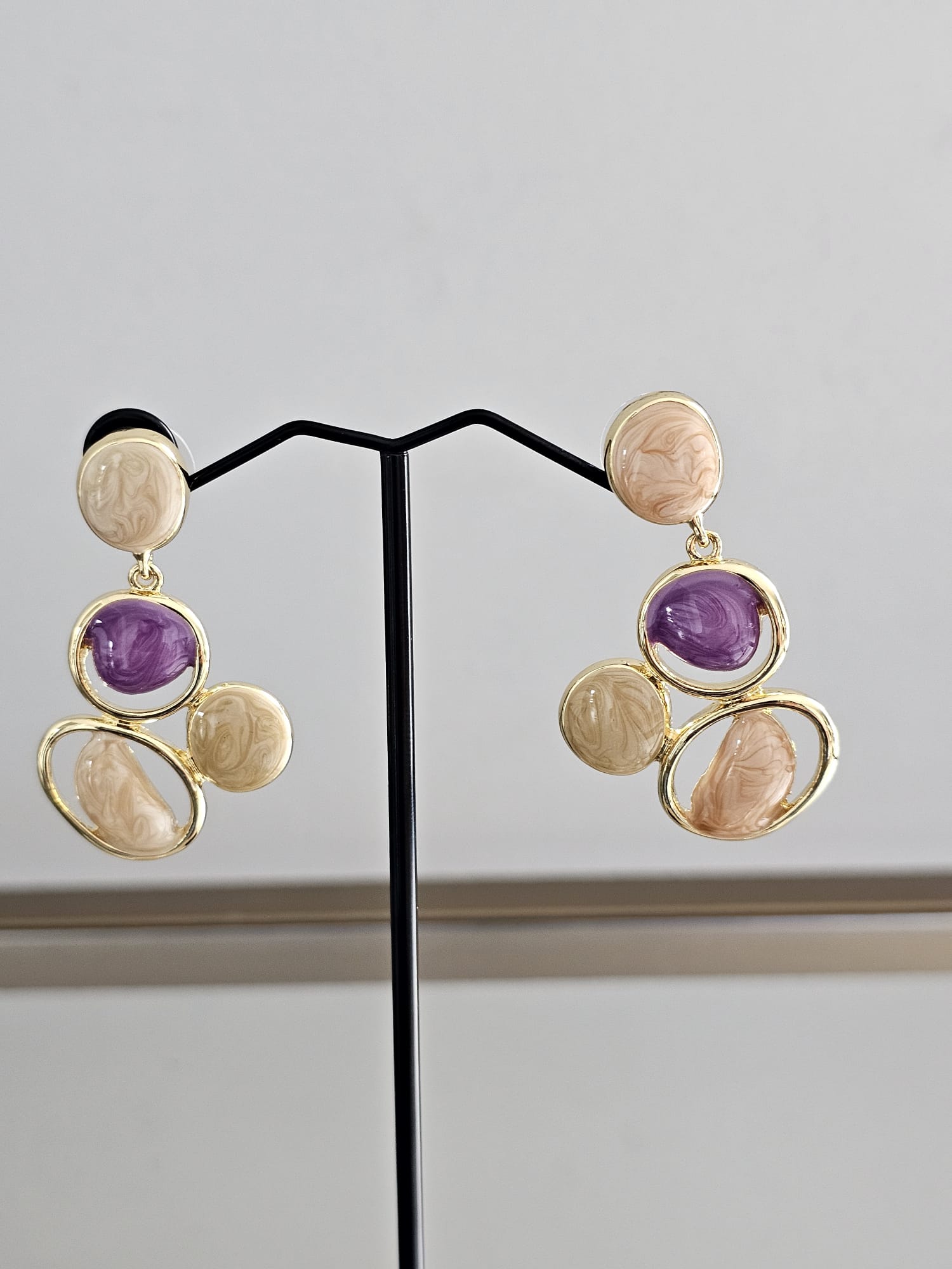 The Twilight Harmony is a stunning earring that beautifully combines the enchanting hues of marbled purple and pink stones with the elegance of non-tarnish gold plating. Each earring features a harmonious blend of these two colors, creating a mesmerizing effect that captures the serene and magical essence of twilight.